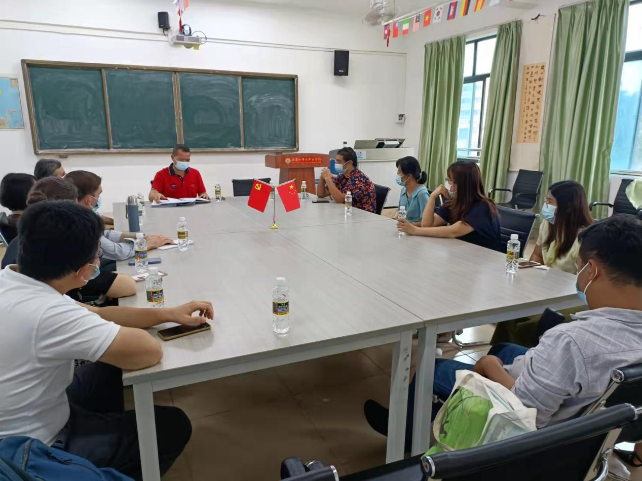 3月22日下午,国际交流中心(东盟研究中心)在综合楼BE503教室召开外籍教师工作会议,国际交流中心(东盟研究中心)副主任陈建奇,外事专员王琳淞,对外汉语教研室主任(代)黎凝,12名外籍教师,及两名实习生吴文比特、吕翔参加会议。
