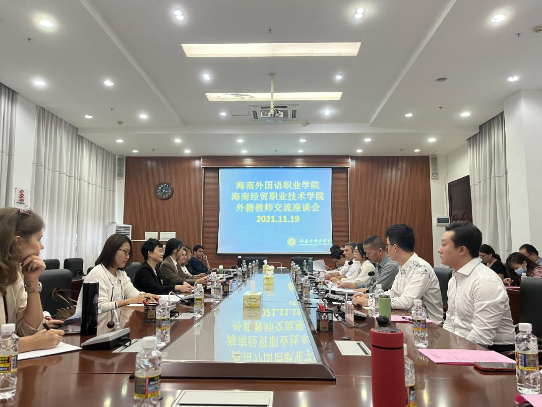会议伊始,播放了学院和中心的宣传片,全体参会人员共同观看了宣传片。随后潘立鹏老师介绍了我方参会人员,陈建奇科长致欢迎辞并介绍了国际交流中心的工作情况,就国际生招收的情况提出了问题。张春玲院长介绍了海南经贸职业技术学院国际教育学院随访人员并发表讲话。讲话结束后,双方教师展开了友好交流,各位教师就教学经验、教学难题、生活经验等进行交谈,本次外籍教师座谈会在老师们愉悦的交流中圆满结束。最后,全体参会人员在广场合影留念。