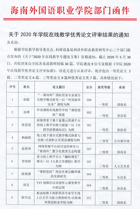 我院教学指导委员会联合科研设备处和涉外职业教育研究中心于2020年4月向全院教师征集“在线教学"专题论文,截稿时共收到全院各系部教师投稿30篇。我院的9位专家根据《学院2020年在线教学优秀论文评审标准》,对论文进行评审,评选出一等奖论文3篇,二等奖论文6篇,三等奖论文9篇和优秀奖论文7篇。其中,国际交流中心对外汉语教研室的对外汉语教师黎凝、张珍妮分别荣获“在线教学优秀论文”三等奖、优秀奖。