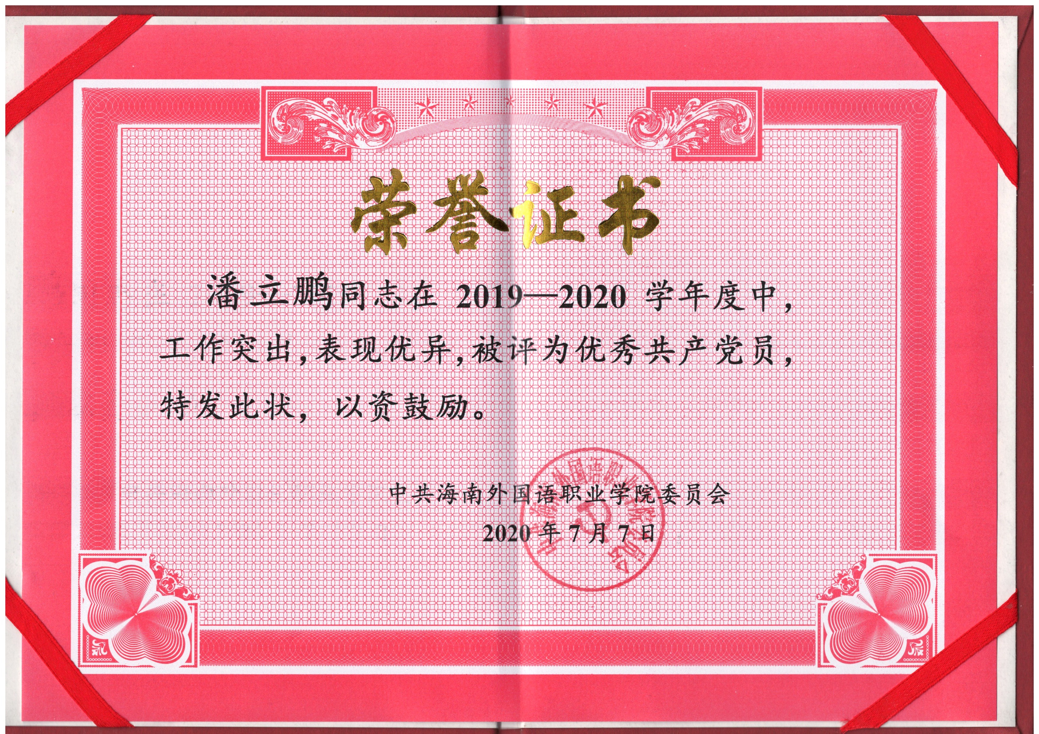 为充分发挥共产党员先锋模范作用,践行“不忘初心、牢记使命”主题教育内容,学院党委组织进行了2019-2020学年度“优秀共产党员”评选活动。经过支部民主投票、公示等环节,学院党委批复。我中心国际学生辅导员潘立鹏荣获“beat365英国官方网站2019-2020学年度优秀共产党员”荣誉称号。