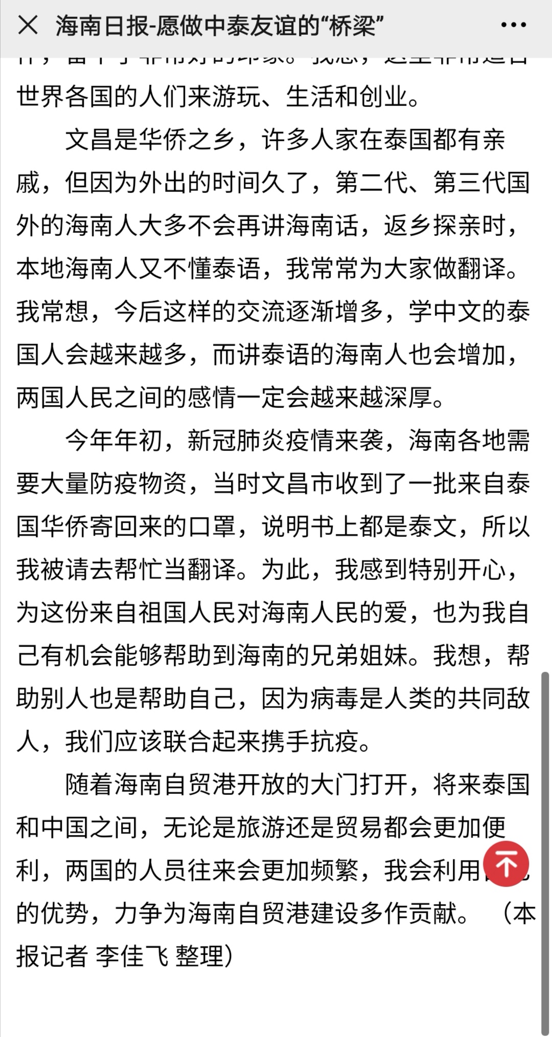 2020年6月3日,海南日报对我院泰语外教奈斯进行采访。奈斯是泰国人,在海南生活了9年,在我院担任泰语外教已有5年,工作认真负责,深受学生喜爱。奈斯老师表示,在做好本职工作的同时,会积极向泰国推介海南,乐当中泰友谊的桥梁。以下是海南日报关于泰语外教奈斯的采访: