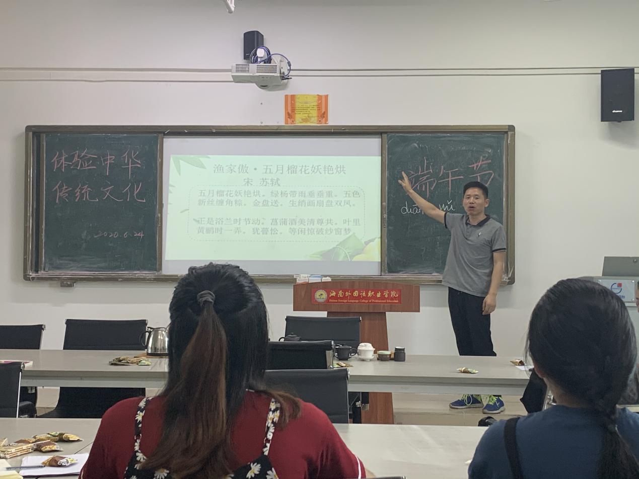 图为赵卫红老师和国际学生赏析端午节主题诗词《渔家傲》