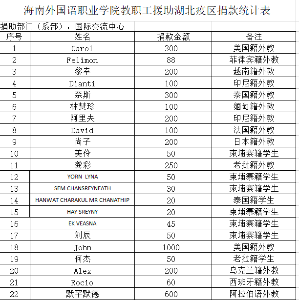(七)中外凝心聚力。经过这段时间的努力,我院的外籍人员均能定期掌握我国的疫情防控情况,主动配合相关媒体的采访工作,传递正能量的价值观,在校外籍人员无物资短缺,外教和国际生的在线教学逐步步入正轨,外籍人员基本可以自主通过相关APP了解中国防疫动态,并积极参与海外院的捐款活动,外籍师生累计捐款4013元。