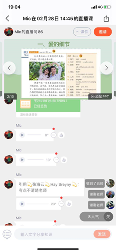 (4)问题:读写课程中的读,听说课中的说,需要示范、纠错与互动。荔枝微课目前的形式,仅能教师发语音,学生不能语音回复造成朗读不能及时反馈。