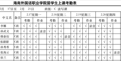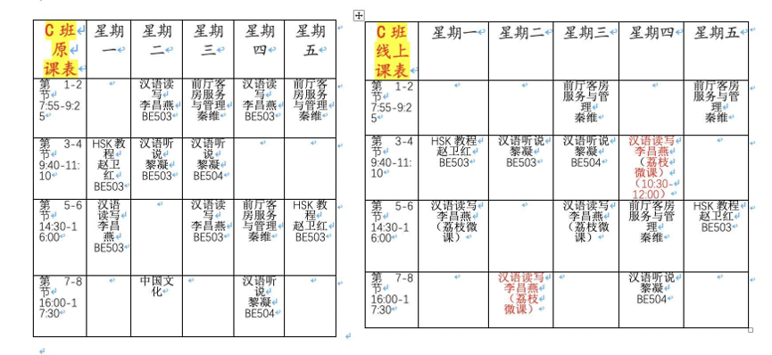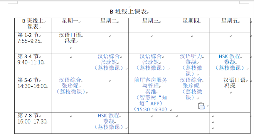 制定了线上教学课表,让教学更加井然有序。目前综合课/读写课在6-8课时/周,听说/口语/听力课2-6课时/周,HSK课程4课时/周。