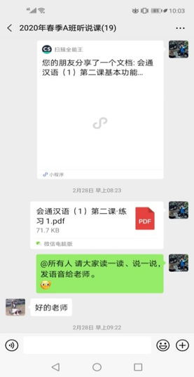 根据学生汉语水平分为ABCD四个班级进行授课。每个班级都建立的班级管理微信群,班主任在群里告知学生关于在线教学的事宜和要求,督促学生学习。每个任课老师又建立了课程学习微信群,在群中发布学习任务、电子教材、课件、学习资源、作业等,方便教学管理。