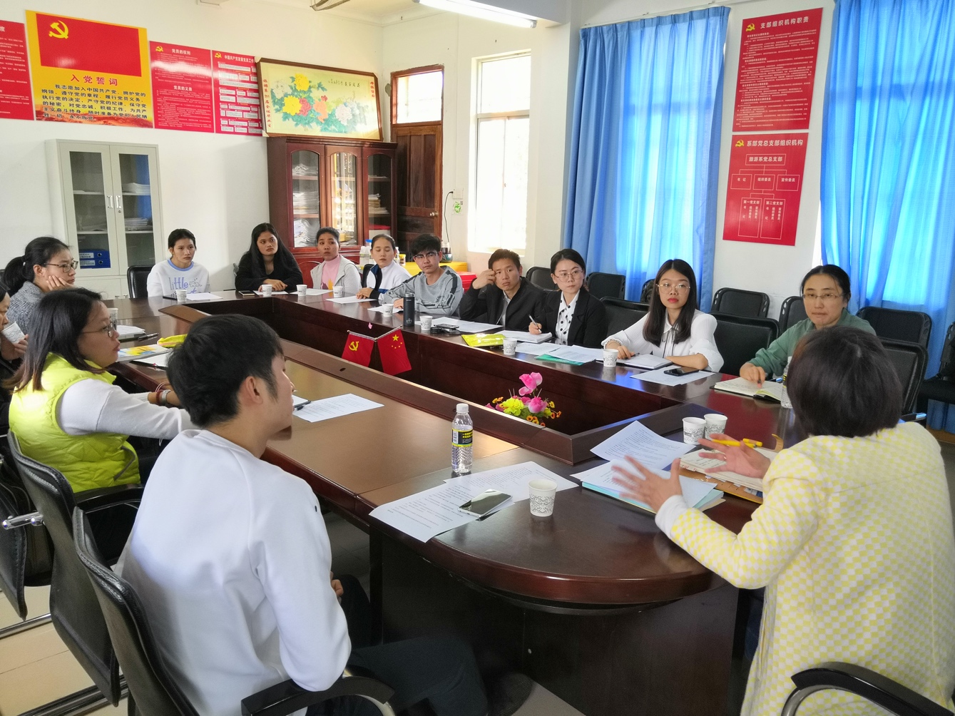 旅游系李旭芳主任首先欢迎我中心的四名对外汉语教师和五名酒店管理专业留学生代表;并介绍了本次旅游系参会师生代表。紧接着就交流提纲进行逐一交流讨论。