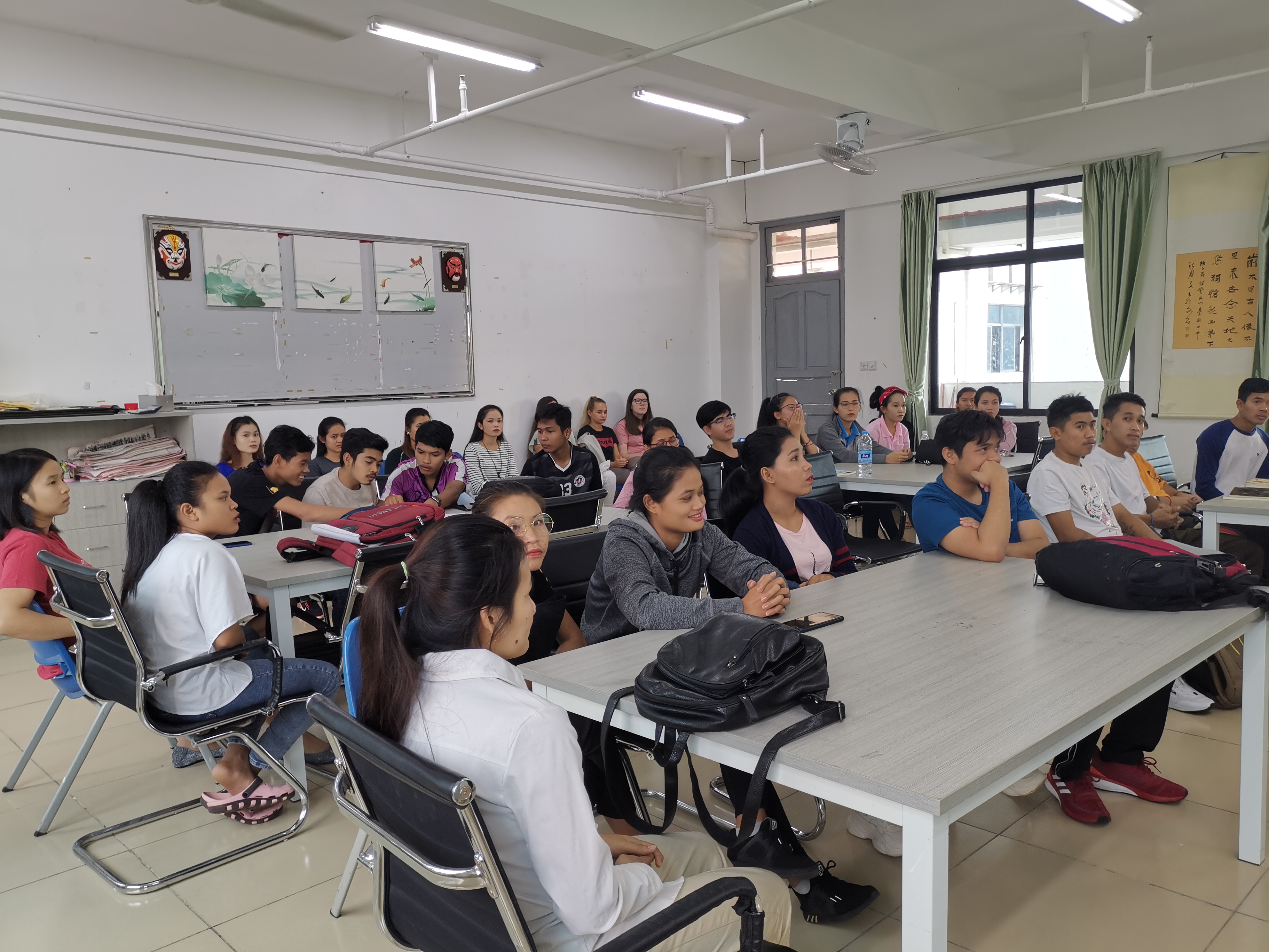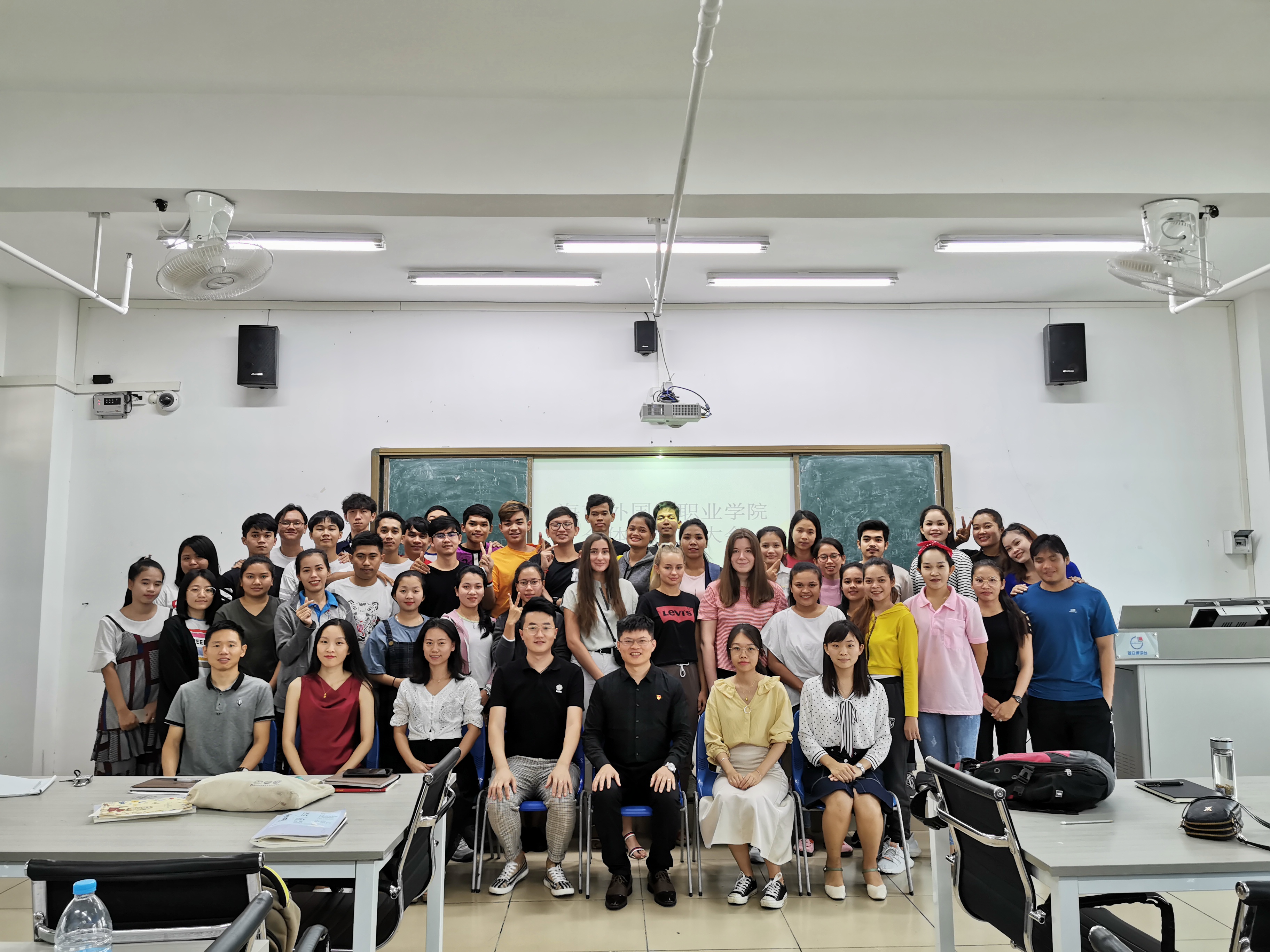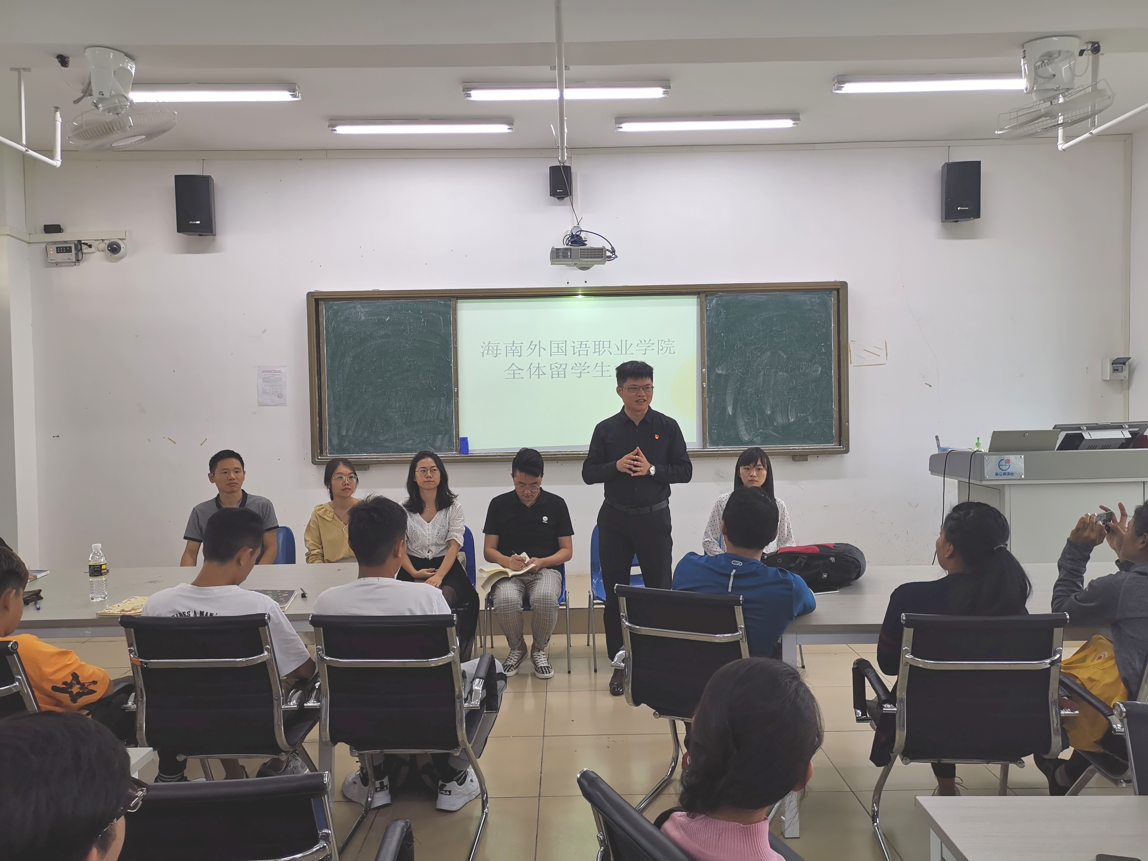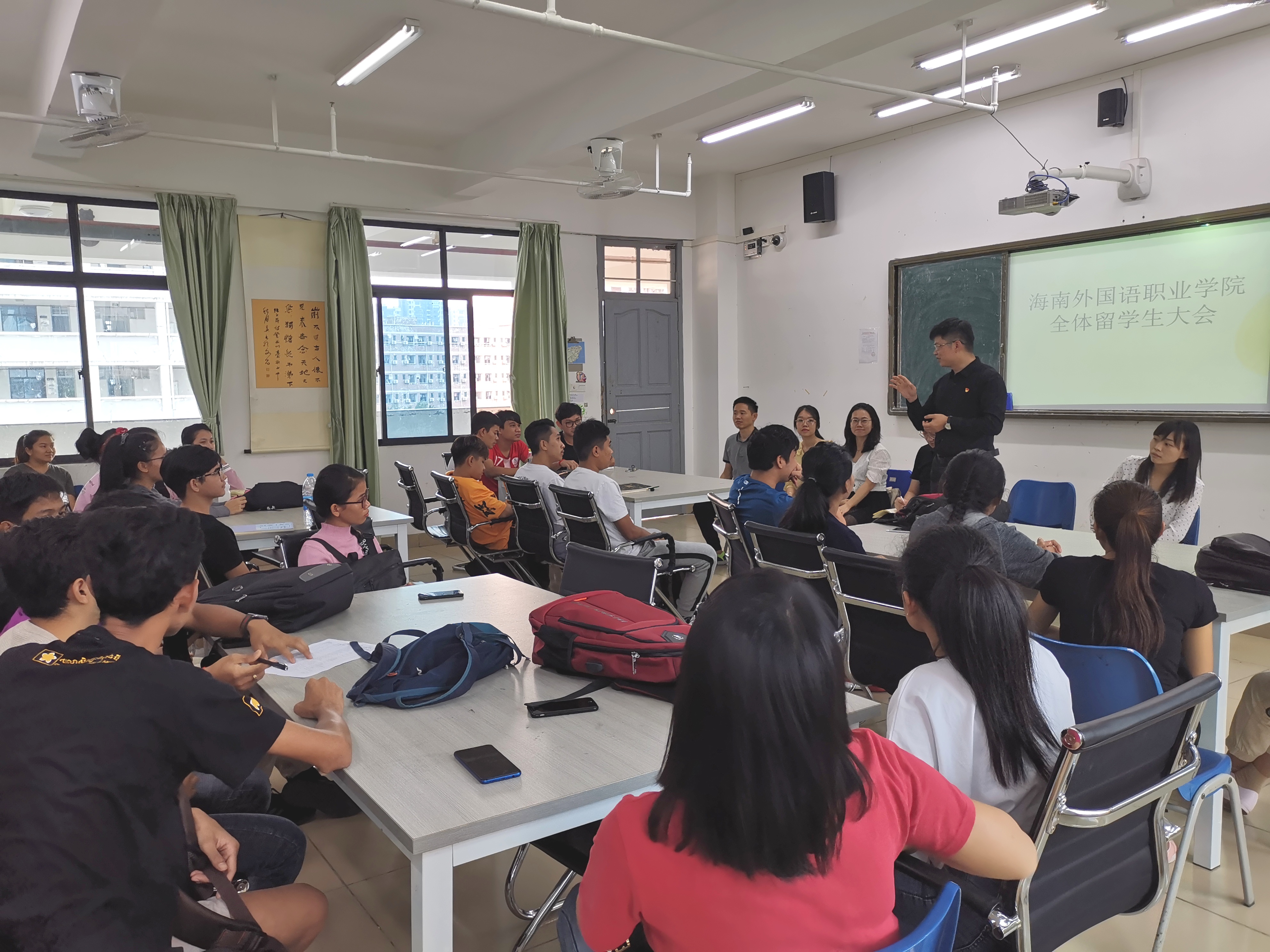2019年11月6日下午,国际交流中心(东盟研究中心)在综合楼BE504教室召开全体国际学生会议。中心主任饶其康、国际学生辅导员潘立鹏、对外汉语教师兼国际学生班主任黎凝、李昌燕、赵卫红,兼职对外汉语教师宋文婷,实习教师程建阳,以及所有在校国际学生参加本次会议。