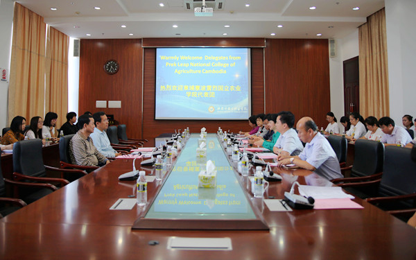 柬埔寨波雷列国立农业学院图恩法萨那(音译,Thun Vathana)校长、蒙索昆(音译,Meng Sokhon)副校长与该学院在我院学习的师生合影