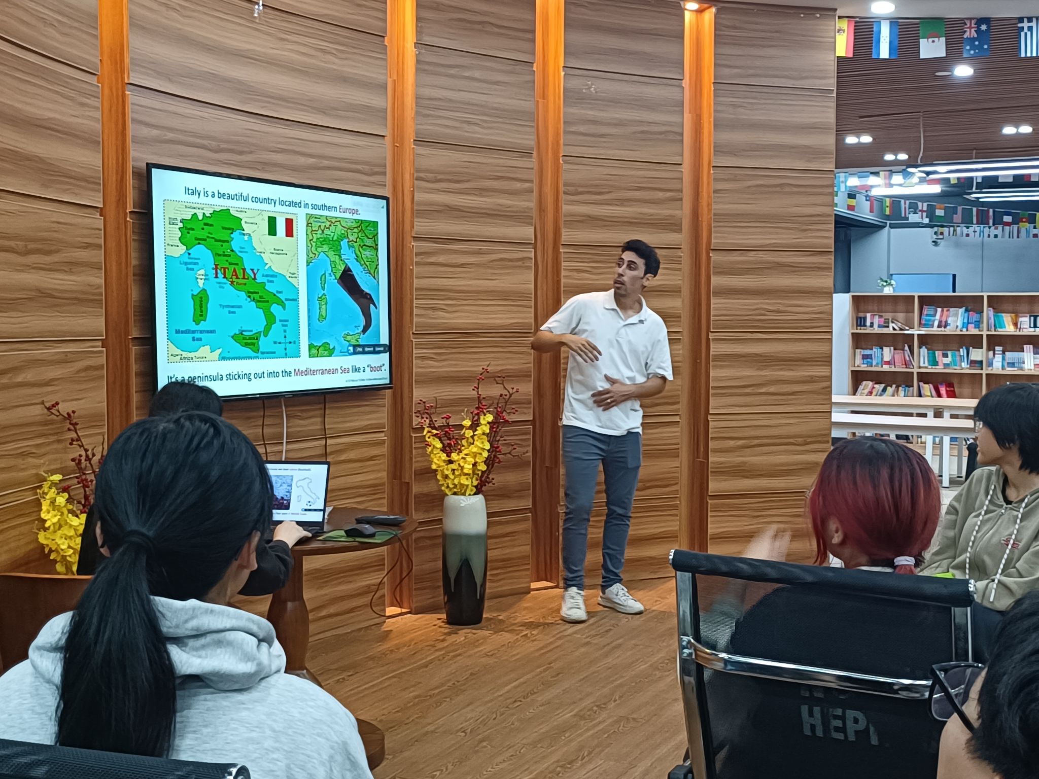Marco微笑着向同学们介绍道:“意大利,这颗镶嵌在南欧的璀璨明珠,宛如一只悠然自得地躺在地中海碧波上的靴子,或许正是意大利人对足球的无限热爱,让这片土地仿佛被赋予了足球的形状。北部,阿尔卑斯山如一道天然的屏障,与法国、瑞士、奥地利、斯洛文尼亚紧密相连;而蜿蜒的亚平宁山脉,则如同一条巨龙,自北向南,贯穿整个意大利。”提及马可波罗,Marco风趣地调侃道:“马可波罗曾在中国游历多年,如今从意大利到中国,只需十小时的飞行,刚好够你在云端小憩片刻,体验一次现代版的‘马可波罗之旅’。”这番生动形象的描述,引得同学们笑声连连,也让他们对中意之间的古老联系有了更深的感悟。