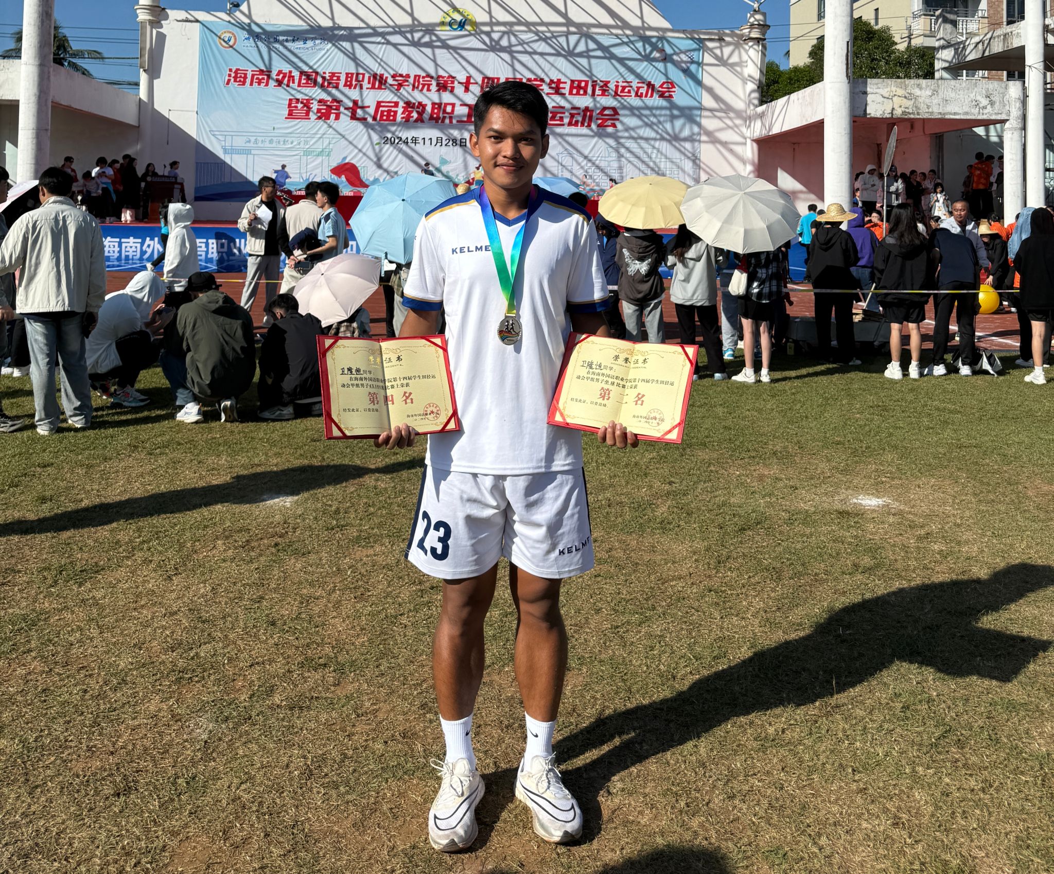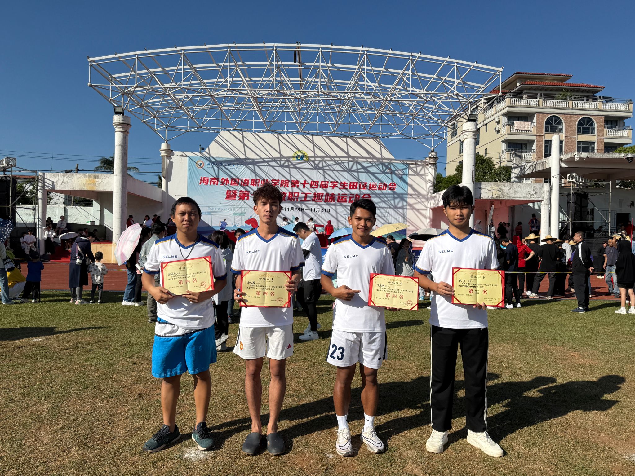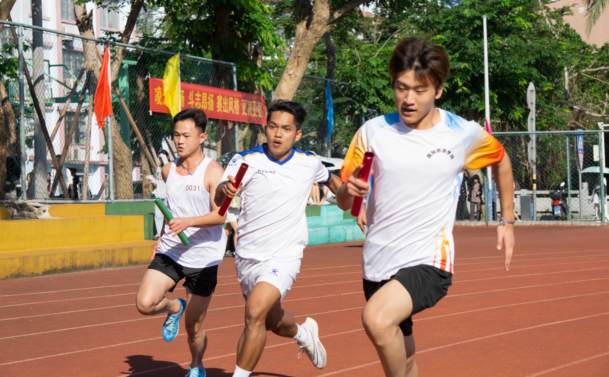 此外,在男子4×100接力赛的激烈比拼中,国际合作与交流处代表队(由卫隆恒、布金隆、欧卡、彭派克四位国际生组成)更是携手并进,以接力棒为桥梁,传递着信任与力量。最终荣获四等奖的好成绩,他们在赛道上展现出的团队协作与拼搏精神,无疑成为了本届运动会上一道亮丽的风景线。他们的每一次交接,都凝聚着对胜利的渴望与对队友的信任,生动诠释了“友谊第一,比赛第二”的体育精神。