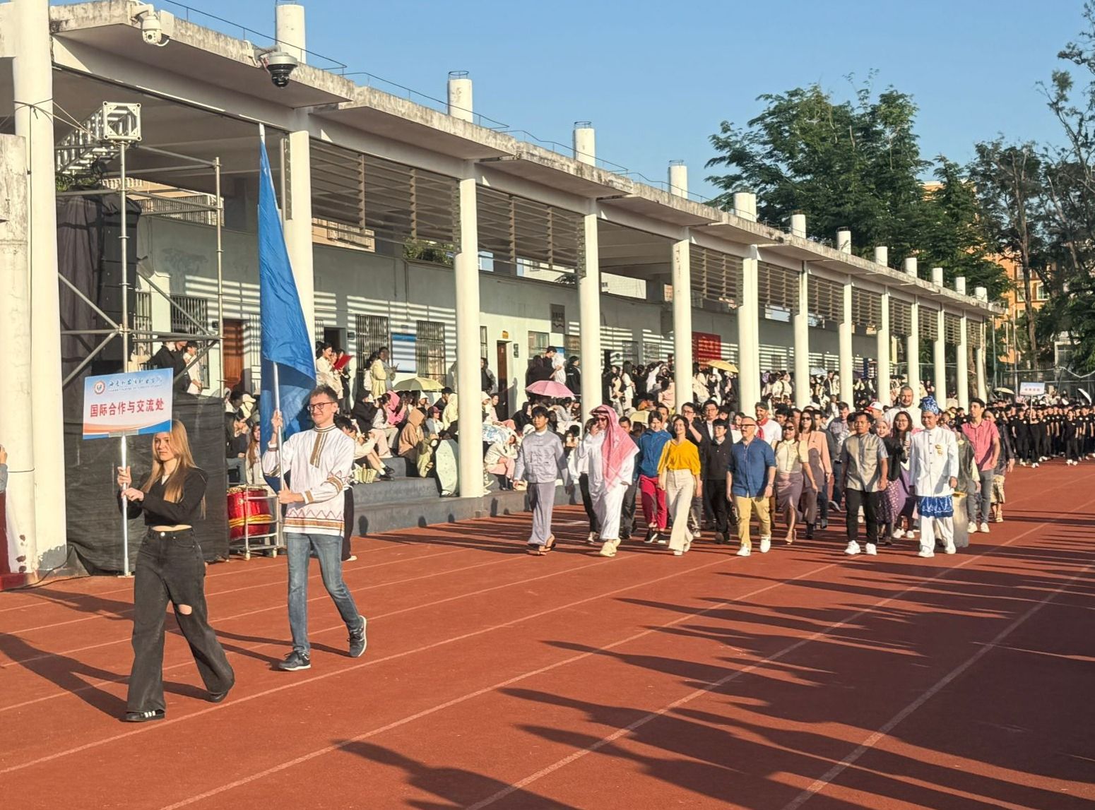 28日上午,随着开幕式的隆重举行,一支由外教和各国留学生组成的国际合作与交流处方阵缓缓步入会场,他们身着民族服装,脸上洋溢着灿烂的笑容,步伐整齐自信、有力,仿佛一股来自五湖四海的友好力量汇聚于此,向世界展示了beat365英国官方网站开放包容、多元共融的国际教育环境。