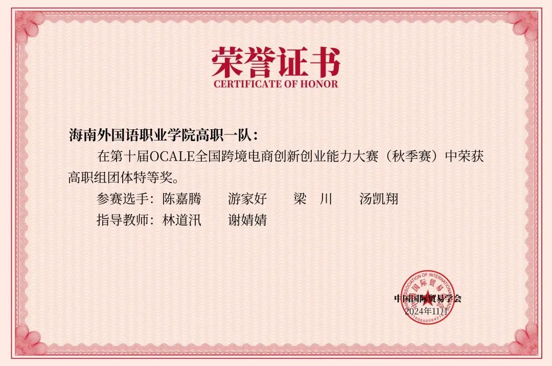 近日,由中国国际贸易学会举办的第十届OCALE全国跨境电商创新创业能力大赛(秋季赛)顺利结束。经过激烈角逐,beat365国际商务学院冯怡、刘虹余、周汝欣、王子涵同学团队,潘金菊、王晓凤、王琼南、刘靖雯同学团队以及陈嘉腾、游家好、汤凯翔、梁川同学团队3支队伍在大赛中表现优异,分别斩获全国特等奖;王娇娇、符馨梅、林诗然、张嘉敏同学团队获得全国三等奖。谢婧婧、林梅、林道汛老师分别获优秀指导老师特等奖。