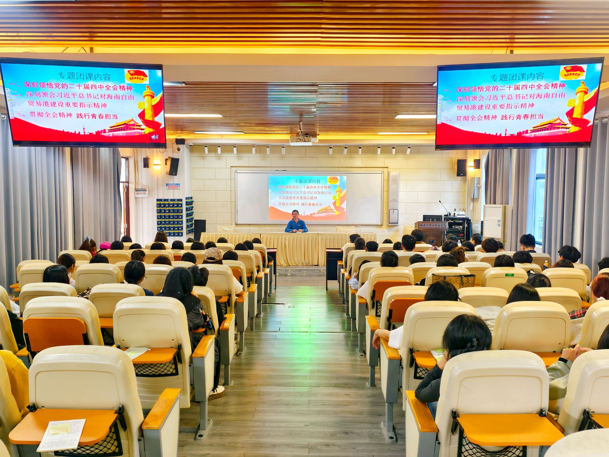 12月12日,学院团总支书记黄华在学校BE101小型学术报告厅讲授“学习贯彻党的二十届四中全会精神 践行海南自由贸易港建设青春担当”专题团课,团总支学生会全体干部、各团支部学生干部骨干共100余人到场聆听本次专题团课。