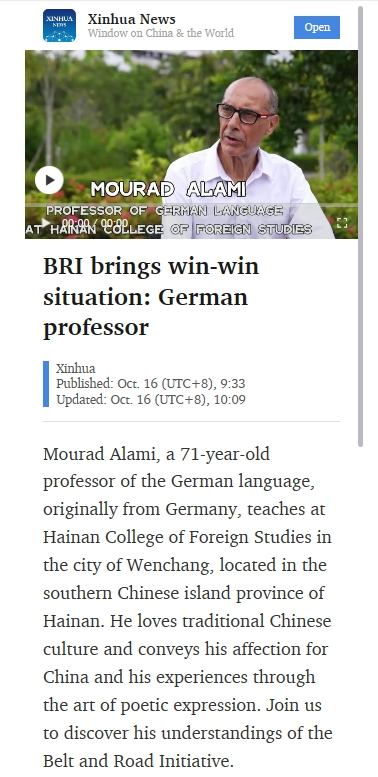 Mourad Alami, a 71-year-old professor of the German language, originally from Germany, teaches at Hainan College of Foreign Studies in the city of Wenchang, located in the southern Chinese island province of Hainan. He loves traditional Chinese culture and conveys his affection for China and his experiences through the art of poetic expression. Join us to discover his understandings of the Belt and Road Initiative.