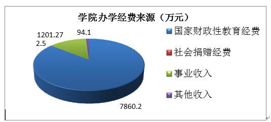 学院积极筹措办学经费,优化资源配置,提高投入产出效益。办学经费的主要来源有国家财政性教育经费、公共财政预算教育经费、社会捐赠经费、学杂费等事业收入。国家财政性教育经费2013年投入为9652.75万元,生均拨款27825.7423元;2014年投入为8506.85万元,生均拨款23729.0098 元;2015年投入为7860.2万元,生均拨款18317.8746 元。