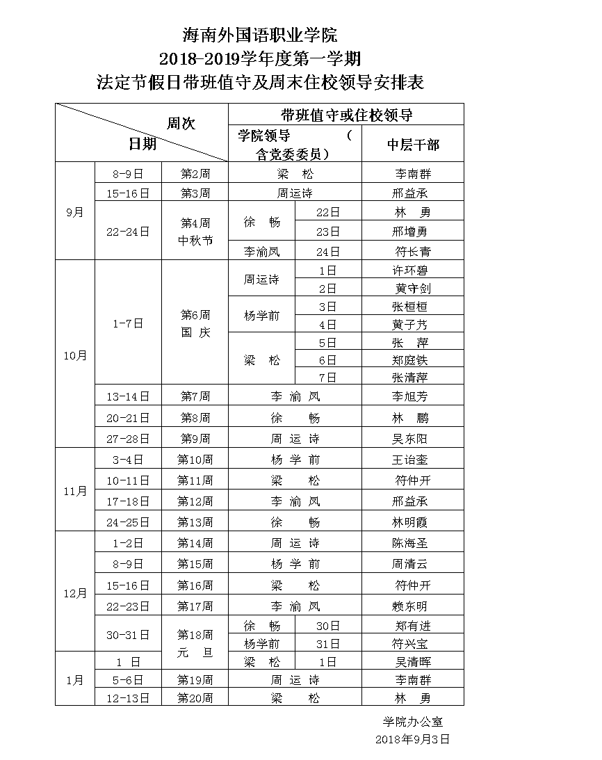 beat365英国官方网站2018-2019学年度第一学期法定节假日带班值守及周末住校领导安排表