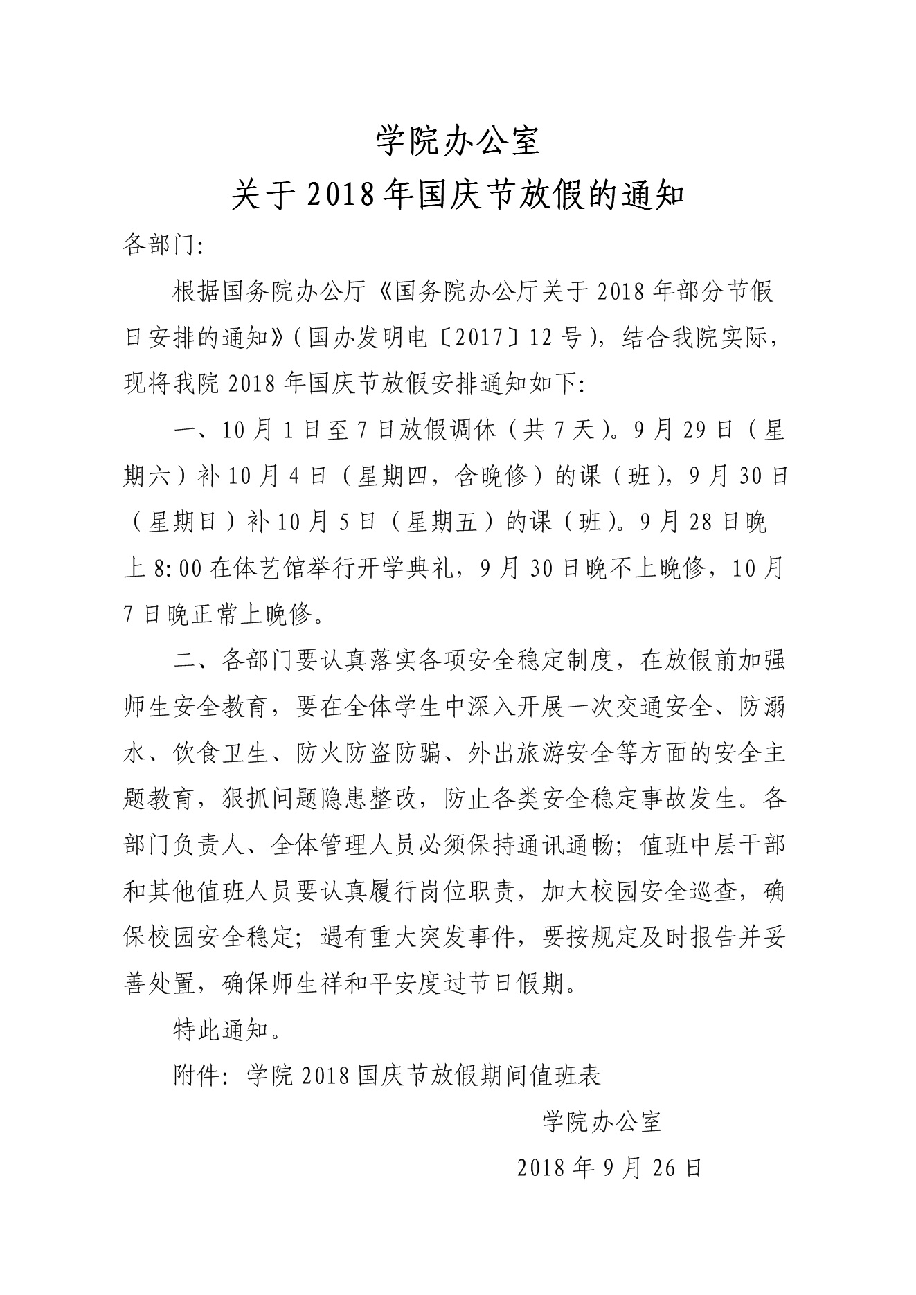 学院办公室关于2018年国庆节放假的通知