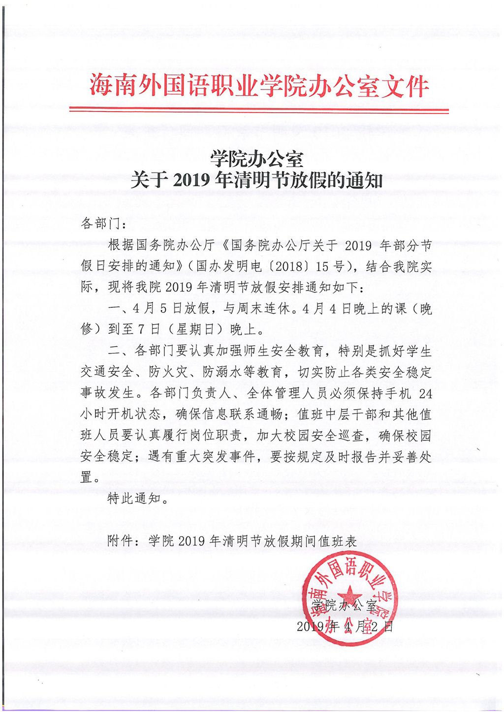 学院办公室关于2019年清明节放假通知
