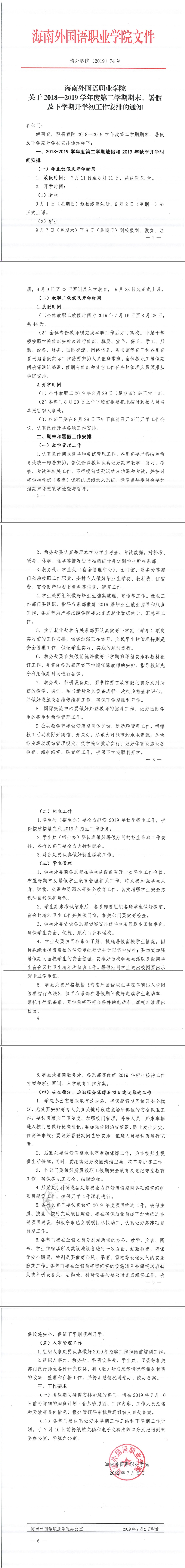 关于2018—2019学年度第二学期期末、暑假及下学期开学初工作安排的通知