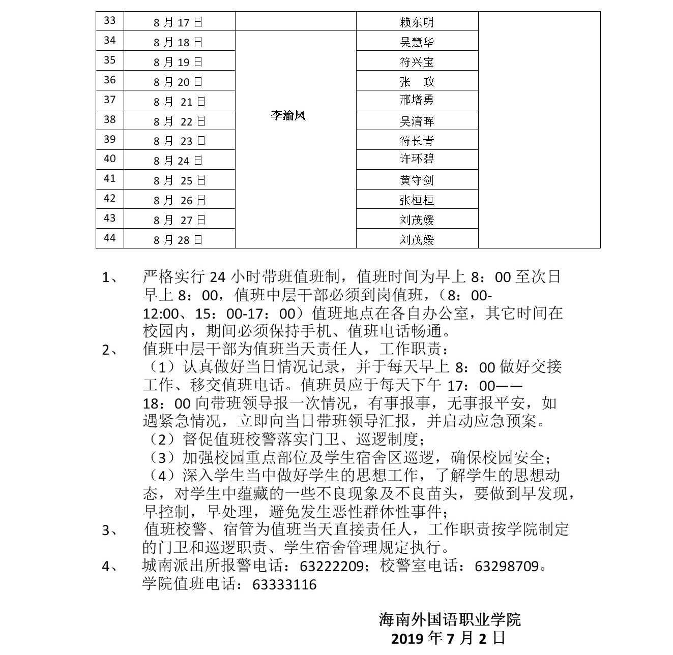 beat365英国官方网站2019年暑假带班值班安排表
