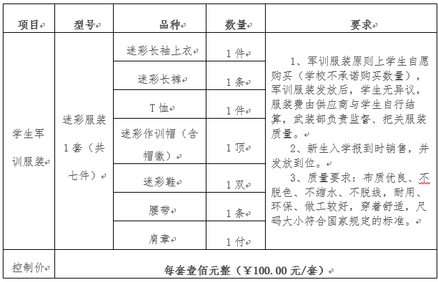 注:各供货商提供的军训服装必须符合上级部门规定的款式。