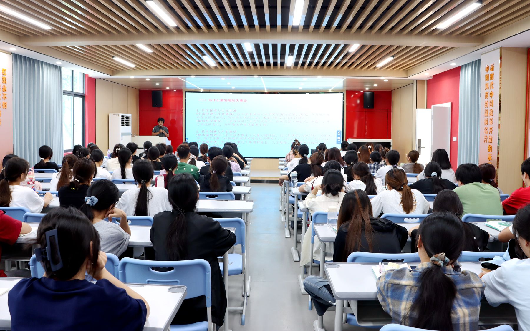 讲座中,宋玉红从五个维度深入介绍我国航天事业的发展成就与时代价值,为师生带来一堂生动的航天精神主题思政课。她以我国航天事业发展的历史脉络开篇,回顾了我国从“两弹一星”到载人航天、从北斗组网到嫦娥探月的奋斗征程。通过一幅幅珍贵影像资料和一个个鲜活案例,充分展现了中国共产党领导下的中国航天事业从无到有、由弱至强的伟大跨越,重点介绍了党的十八大以来我国航天领域的标志性成果。“特别能吃苦、特别能战斗、特别能攻关、特别能奉献”的载人航天精神如何铸就?宋玉红结合文昌发射场一线工作者的感人事迹进行解答,并介绍了航天精神与科学家精神、工匠精神的深度融合。