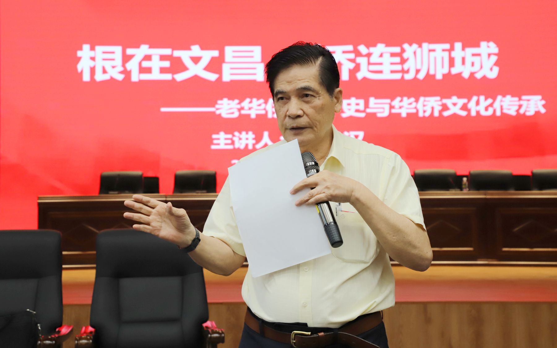 5月12日下午,“根在文昌 桥连狮城——老华侨奋斗史与华侨文化传承”分享交流会在新阶梯教室报告厅举行,特别邀请新加坡海南协会理事长陈学汉到校,就老华侨奋斗史与华文化传承主题与师生面对面分享交流。