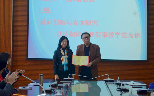 随后,熊教授从学术发展的历史来诠释了“界面”研究,指出了“界面”研究的必要性和可行性,提出了在教学和科研中运用“界面”的新思想,还介绍了“认知诗学”这一全新理论,并结合“界面”概念,以认知诗学和叙事教学法为例,阐述了认知语言学与诗学的结合所形成的新界面以及叙事教学法对科研创新的作用和意义。
