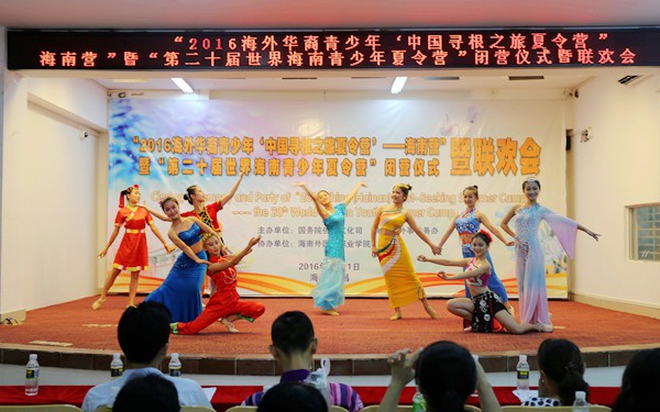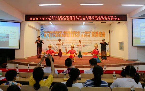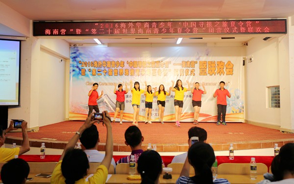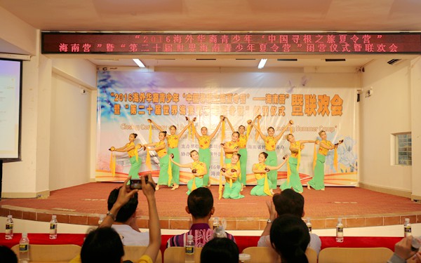 闭营仪式结束后,营员们为我们带来了精彩的汇报演出暨联欢会,他们用自己精彩的表演为此次夏令营画上了完美的句号。联欢会在一场《椰壳迎宾》的舞蹈中欢乐地拉开帷幕,椰壳欢乐的响声,优美的舞姿赢得了大家阵阵掌声。泰国华裔青少年们为我们跳起了泰国的传统舞蹈,印尼华裔青少年们跳起了流行的印尼街舞,舞蹈让大家沉醉于欢乐声中;一曲《望乡词》唱出了乡思之痛,揪住了在场所有人的心;一场动人的海南黎族风情舞蹈《文昌欢歌》让大家感受了少数民族的风情;此外,联欢会还穿插了“丢手绢”和“老鹰抓小鸡”等游戏,让现场气氛不断高涨。最后联欢会在全体的合唱《爱我中华》中结束。在一片离别声中,营员们相互道别、合影留念,共同纪念这美好而又难忘的短暂时光。