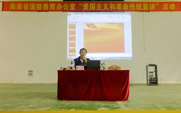 宣讲中,程小斌处长向新生从两大历史事件“红军长征”、“琼崖革命”讲解了中国革命历史的发展,并通过结合当时“红军长征”中的历史背景以及湘江之战、遵义会议、四渡赤水、琼崖土地革命、二十三年红旗不倒等重要历史事件,与新生们一起学习了红军长征胜利对培育中国共产党和人民军队爱国主义精神和革命精神的重大意义,以及学习了琼崖革命“二十三年红旗不倒”的革命精神。
