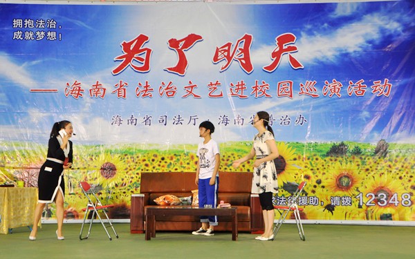 “为了明天——海南省法治文艺进校园”巡演活动,从2013年启动以来,共巡演260多场。行程遍及全省除三沙市以外的25个市县(区),共有40多万名中学生和1万多名学生家长、教师员工观看了演出,受到了广大师生和家长的热烈欢迎,在社会上引起了广泛的关注,并取得了良好的普法效果。
