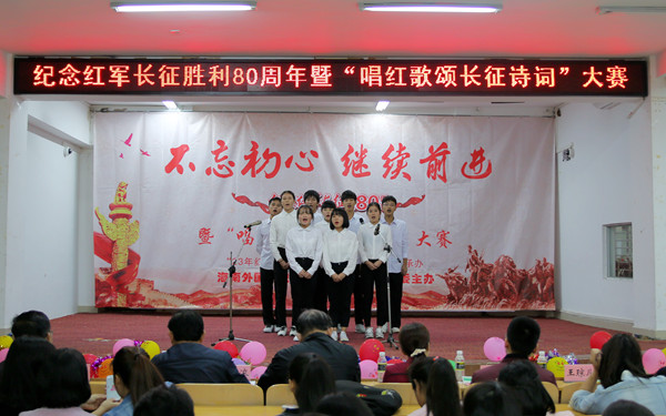 12月8日晚,由我院23年红旗不倒读书协会和时事协会联合主办的“不忘初心、继续前进”纪念红军长征胜利80周年暨唱红歌颂长征诗词大赛在图书馆多功能报告厅举行。社科部主要负责人周清云、关工委主任韩祝畴等有关部门负责人和广大师生一同观看了大赛。