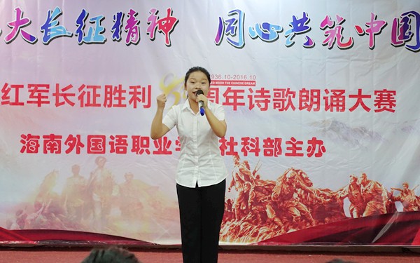 长征不仅是中国历史中一大庄伟的里程碑,也是世界历史上的一大奇迹。弘扬长征精神,是我们后辈义不容辞的艰巨任务。通过举办此次诗歌朗诵比赛,进一步增强了同学们对长征在中国革命史和军队历史上重要地位和意义的认识,以及领悟学习了当年长征途中红军战士克服一切艰难险阻迎难而上的顽强拼搏精神。