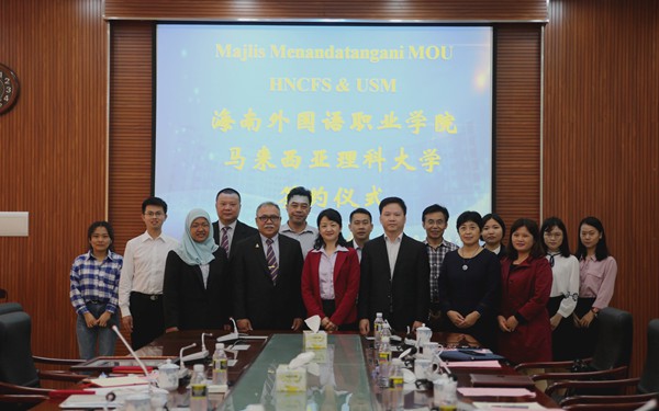 3月22日上午,马来西亚理科大学副校长拿督·阿德楠·胡瑟因博士、教授,马来西亚理科大学人文学院院长娜丽玛·萨玛特博士、教授,协调专员吴尚雄博士、副教授一行3人访问我院,我院李渝凤院长、杨学前副院长热情接待了来宾,双方在综合楼七楼第一会议室开展座谈,就两校合作事宜进行深入交流,并共同签署了两校合作办学备忘录。党委办公室、学院办公室、教务处、国际交流中心和各相关系部主任、部分教师参加座谈。杨学前副院长主持座谈会。