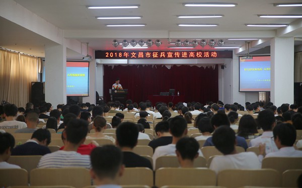 为全面开展大学生征兵工作,动员和激励更多高素质青年人才参军入伍,进一步增强征兵宣传效果,5月14日上午,2018年文昌市征兵宣传进高校活动在我院图书馆多功能报告厅举行。此次征兵政策宣讲,与大学生面对面进行交流,鼓励我院优秀青年响应祖国号召,投身国防建设。