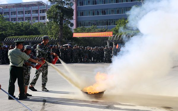 在进行了一系列示范之后,为了让新生们能够切实了解和掌握灭火器的使用,活动现场还邀请了各个连的新生代表进行操作演练,同学们在灭活过程中按照教官指导和要求,迅速将火势扑灭。