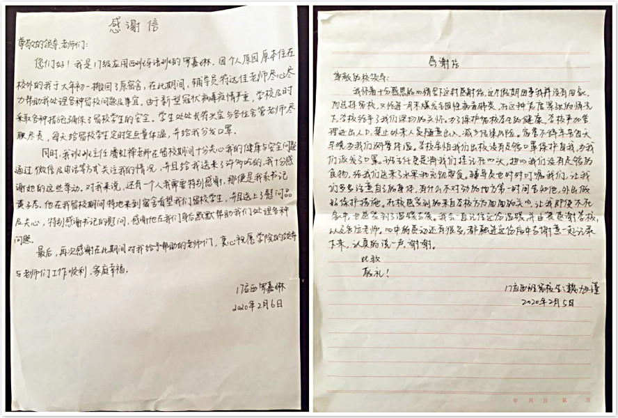 两名留校学生写的感谢信中表达了对潘虹禅深深的感激之情,感谢潘虹禅带给她们温暖