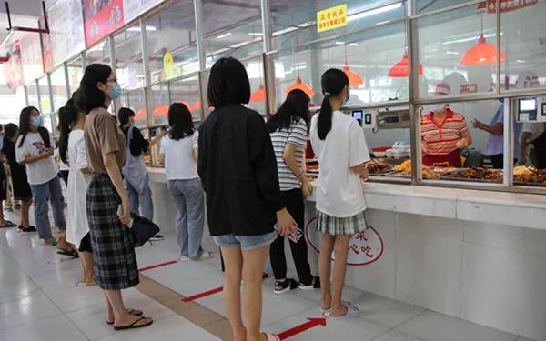 正午十二点,我们带着自己的饭盒有序进入食堂,为了避免同学聚集,食堂设置出口和入口两个通道。进入食堂前,首先要通过消毒和测温通道,显示正常才能进入食堂。在打菜窗口,地上贴着的排队标记,引导大家保持1米安全距离有序排队打菜。