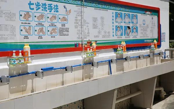 食堂门口配置感应水龙头、消毒液、洗洁精