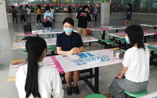 在学院食堂,看到同学们主动间隔一米排队打饭,李院长非常满意。她向食堂工作人员询问了食堂整体供餐情况,对食堂规范管理提出了建议和要求。要求食堂工作人员注重配菜的营养健康,让同学们吃得安全、吃得健康。李院长还与自带饭盒打包带走就餐的英语教育专业学生亲切交谈,仔细询问学生对食堂菜肴的建议,叮嘱学生加强营养,并鼓励学生努力学习,提升英语口语水平,毕业后为海南自贸港建设和海南省公民外语水平提升贡献力量。
