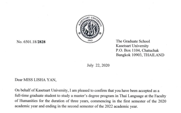 7月22日,我院再传喜讯,东语系应用泰语专业2016级严丽莎同学收到泰国农业大学录取通知书,考上了该大学泰语专业硕士研究生。