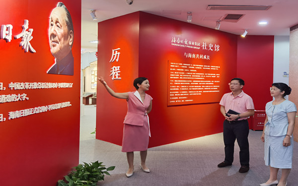 韩潮光董事长带领李渝凤院长一行参观了海南日报报业集团社史馆展,向李院长介绍了海南日报的发展历程、发展成果及南海网发展现状及建设内容等情况。李渝凤院长一边参观,一边感慨海南日报与海南共成长,见证了海南日新月异的的建设发展。