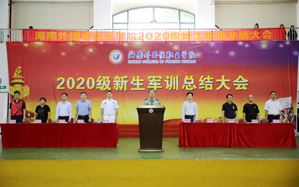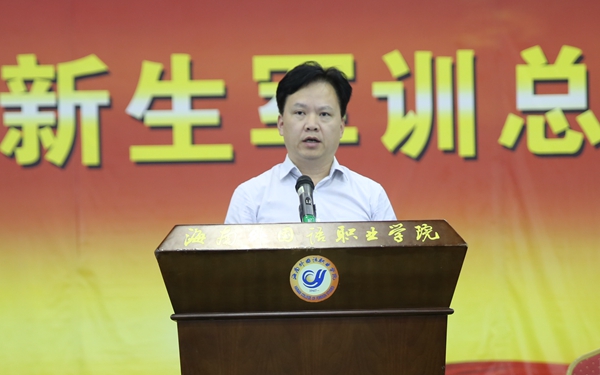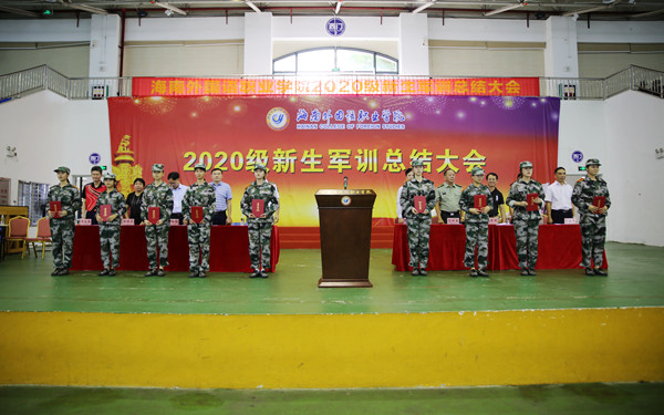 10月25日下午,我院2020级新生军训总结大会在体艺馆举行。学院副院长杨学前、文昌市武装部赵金路、各部门(系部)主要领导、全体承训官兵、参训新生参加大会。学生处处长主持大会。
