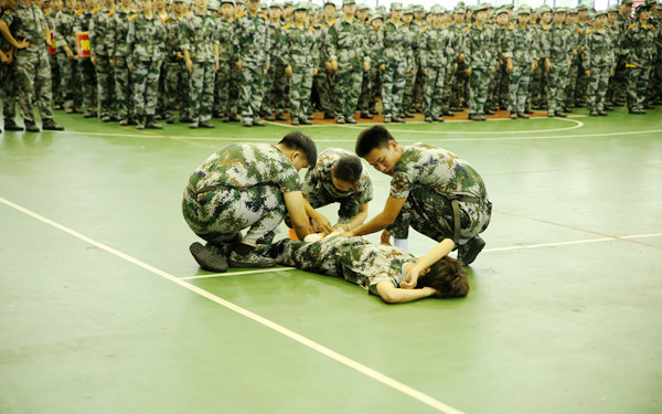 各连队列队完毕后,分列式表演正式开始。30个连队以饱满的精神状态接受检阅,受阅方队在教官的指挥下依次通过主席台。他们斗志昂扬、口号响亮、队列整齐,展现了2020级新生的风采。紧接着部分优秀军训学员进行了军事技能汇报表演,如军体拳和战场救护演练,一系列的精彩的表演赢得了现场观众的阵阵掌声。
