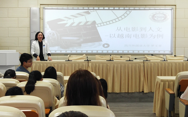 11月26日上午,东语系东盟语言文化教研室八个专业的全体师生在AE101教室聆听了四川外国语大学东方语学院院长罗文青教授的讲座《从电影到人文--以越南电影为例》。