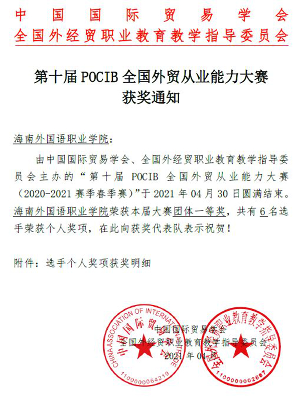 4月30日,由中国国际贸易学会、全国外经贸职业教育教学指导委员会主办的第十届POCIB全国外贸从业能力大赛(春季赛)圆满结束,我院国际商务系派出10名学生参加比赛,并在比赛中表现突出,摘获团体一等奖。同时,商务英语专业学生吴海婷获得个人二等奖,国际贸易专业学生孙雨诗、肖燕燕,以及商务英语专业学生王语彤、李少妹、毛又玲分别获得个人三等奖,夏冰、韩天鹏两位老师获得“优秀指导老师”称号。