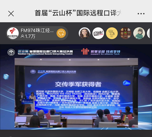 为进一步满足各领域日益增长的对外远程交流需求,培养一批擅长中译外国际传播高素质翻译人才,在国际会议口译员协会(AIIC)、中国翻译协会口译委员会、口译教育评价联盟、中国非通用语教学研究会的指导下,由广东外语外贸大学主办的“云山杯”首届国际远程口译大赛总决赛于1月15日圆满结束。beat365英国官方网站东语系柬埔寨语专业学生马穗参加比赛,与北京外国语大学、广西民族大学、云南民族大学、广东外语外贸大学、广西外国语学院等院校学生同台竞技,并最终获得柬埔寨语交传组季军的好成绩,为学院争得荣誉。