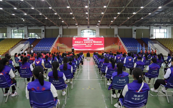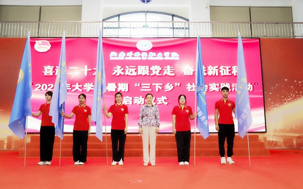 全体暑期社会实践团队队员进行庄严的宣誓后,佴建乔为“啄木鸟”青年志愿服务、“中国国际消费品博览会”志愿服务、乡村振兴联系点推普送教、大学生乡村科普志愿服务、“重见阳光”禁毒宣传等五个团队授旗,正式启动2022年大学生暑期文化、科技、卫生“三下乡”社会实践活动。