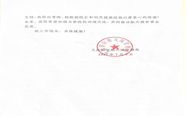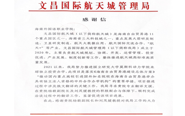 在文昌国际航天城管理局推进与俄罗斯国立研究大学莫斯科动力学院相关合作期间,我院充分发挥外语办学优势,选派外语教师提供翻译服务。我院教师以认真严谨的态度、专业周到的服务、无私奉献的精神,圆满地完成了各项翻译工作,获得了外方嘉宾的高度肯定。为此,文昌国际航天城管理局特发来感谢信,向我院及外语教师志愿者表示衷心的感谢。